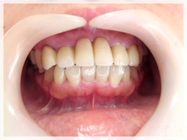 まずは歯周病治療をし、噛み合わせにおいて重要な奥歯の治療を保険治療と自費治療により終わらせてから上の前歯の治療を保険治療で行いました。ブリッジの設計が良くなかったせいもあり動揺と出っ歯になってきていた状態でしたので、補綴学的に正しい設計を提案し保険治療にてブリッジのやりかえをしました。