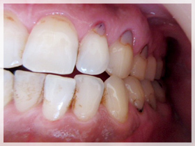 ほぼ全体的に歯のキワにつめものCR(保険のプラスチックのつめもの)がしてあり、壊れてきている、噛み合わせがこの人にあっておらずバランスが取れていない。