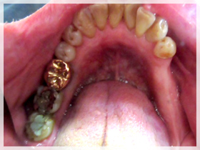 まずは歯石除去、PMTC、などを徹底的に行い歯周状態の改善をし、歯周病を増悪させている咬合の調整をし、下の左右のブリッジをインプラントにしました。