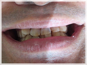 歯科恐怖症例の為、治療の必要性を知りながら歯科医院への通院ができずにおり、当院に来院。 全歯にわたり虫歯が進行しており、歯周病も進行していました。また、長期間虫歯を放置した事で、噛み合わせも悪くなり顔の歪みも見られます。